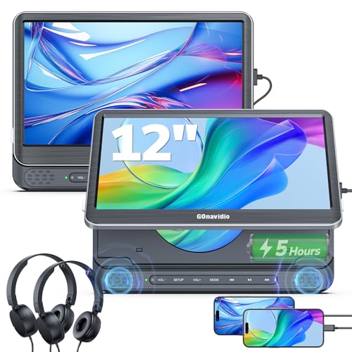 GOnavidio 12" Dual Car DVD Players with HDMI Input, Headrest DVD Players for Car with Headphones, 5-Hour Battery, 1366 * 768 Screen Mirroring, USB/TF Reader, MP4/MKV, Region Free, Last Memory